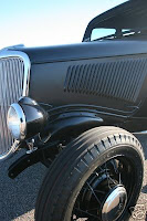 I use a mig welder for all assembly, and butt weld the joints together in most cases. I will hammer form these seams on flat panels to keep distortion to a minimum when grinding the weld flat. Its important to constantly "step back" and view your project from a distance as your eye will catch many imperfections and disproportions before your tape measure will. Making the seams through the belt line rib allows you to hide the weld and minimize distortion as the curve will hold its shape better than a a flat panel will and you can smooth it over with filler when the car is painted. Next was to address the rear window panel that had been rudely cut out with a torch. Again my friend Donnie Smart had a rear window section out of a coupe. I learned that the coupe and sedan are different, in that the sedan had a curved bottom edge and the coupe is straight. It came with the prerequisit bullet hole, which I debated on leaving it in the body, but finally decided to weld it closed.
